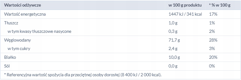 - Węglowodany 71,7 g, w tym cukry 2,4 g;
